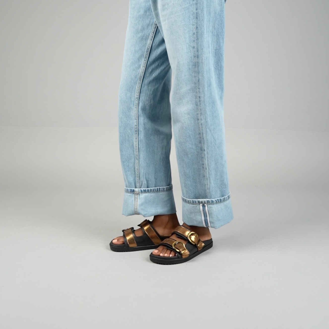 Introducing Amelie Vegan Black + Bronze: your comfiest, cruelty-free slide. The flexible sole and adjustable vintage gold buckle will keep your feet happy all day. With a wavy texture for extra grip!