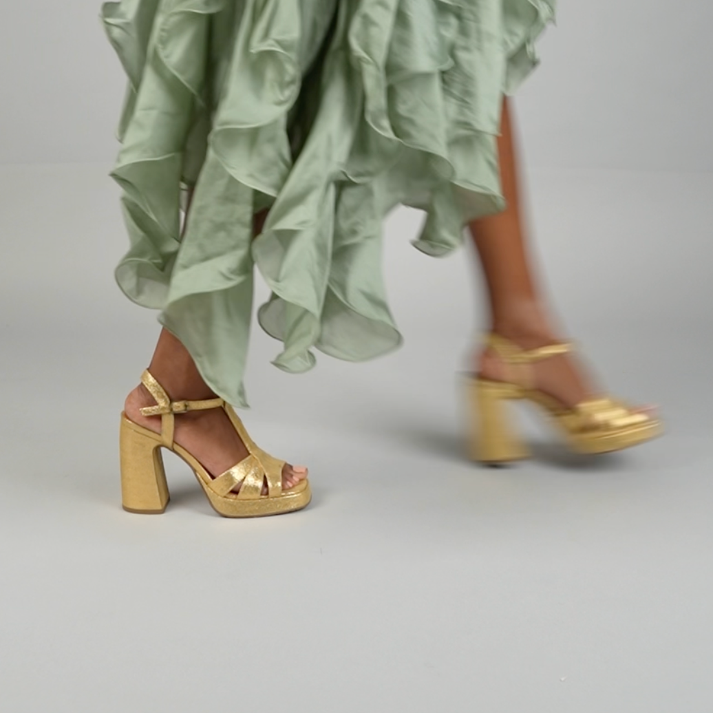 Introducing Gaia Gold, the ultimate combination of style and comfort! With a high heel fun block heel, flattering t bar design, and metallic gold color, these sandals will elevate any party or wedding look with a touch of 70s flair. Plus, the ankle strap ensures a comfortable fit, while the platform adds extra support. Get ready to dance the night away in Gaia Gold!