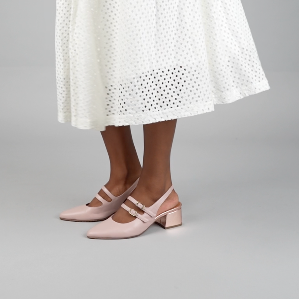 Esska’s Layal twin-strap Mary Jane shoes in Metallic blend style and comfort perfectly. These low-heeled mary jane shoes feature an adjustable double strap, ideal for high arches, and a block heel measuring 45 mm for added stability. The slingback design adds a touch of elegance, while the mix of pink suede and metallic leather makes for a unique and trendy look. Step out in style and comfort with Layal!
