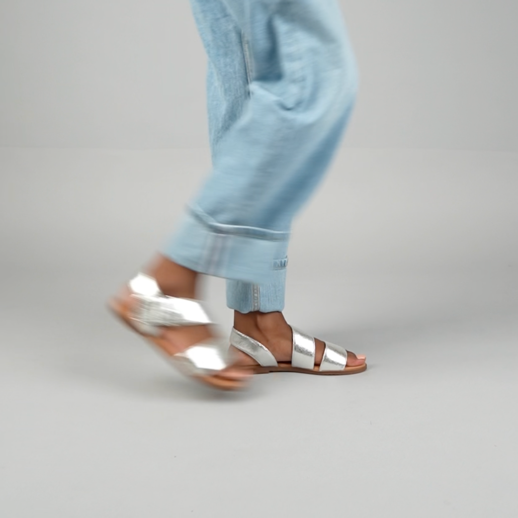Add some edge to your outfit with the Nicole Vegan Silver sandal. Featuring a thick multi-strap design and a bold buckle, this flat sandal is both fun and stylish. The soft padded sole adds extra comfort and the vegan metallic silver fabric makes it stand out. Go ahead, make a statement with these quirky yet versatile sandals!